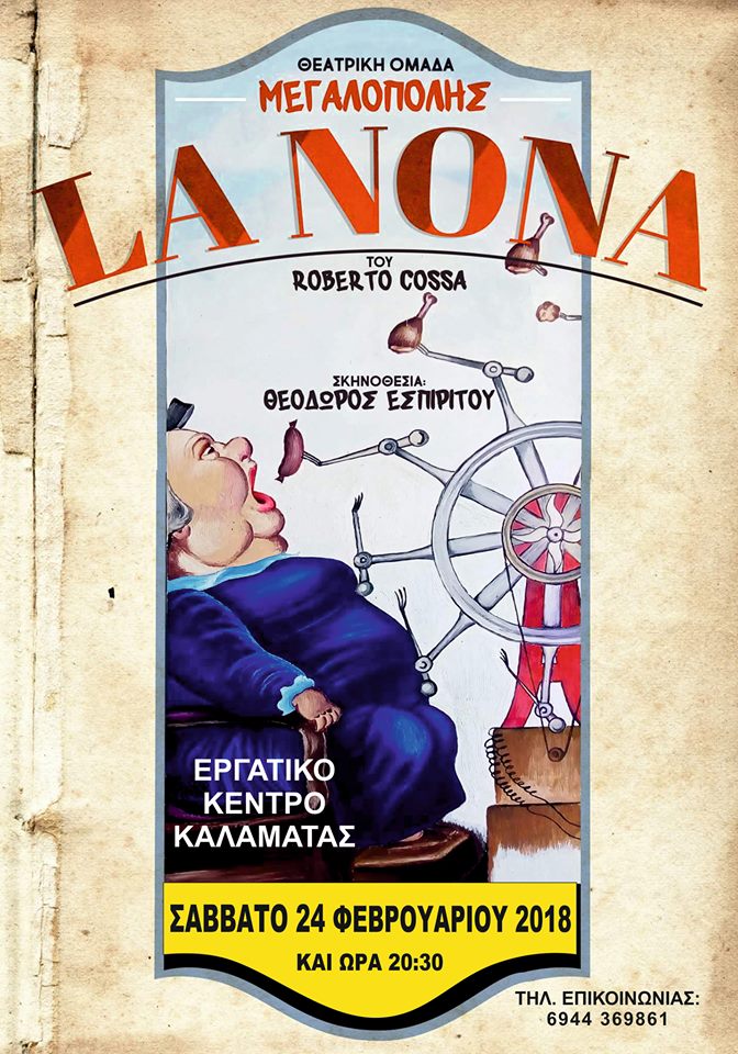 Η Θεατρική Ομάδα Μεγαλόπολης κλείνει την χειμερινή περιοδεία της “Nona”με μία και μοναδική παράσταση αυτό το Σάββατο 24 Φλεβάρη 2018 στο Εργατικό Κέντρο της Καλαμάτας με ώρα έναρξης την 20.30΄.