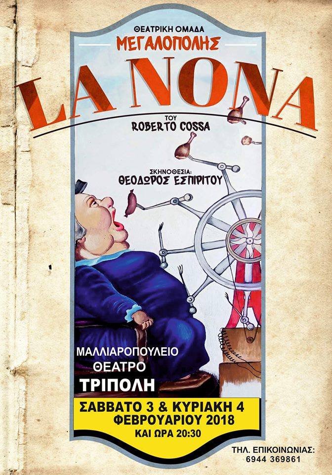 Η Θεατρική Ομάδα Μεγαλόπολης συνεχίζoντας την πετυχημένη πορεία της «Nona” θα βρίσκεται αυτό το Σαββατοκύριακο 3 & 4 Φεβρουαρίου 2018 στο Μαλλιαροπούλειο Δημοτικό Θέατρο της Τρίπολης, με ώρα έναρξης της παράστασης την 20.30΄.