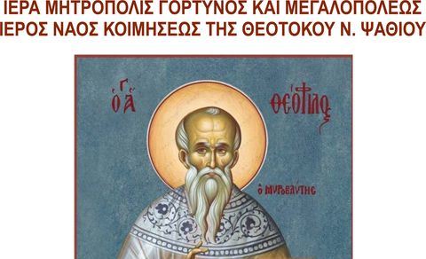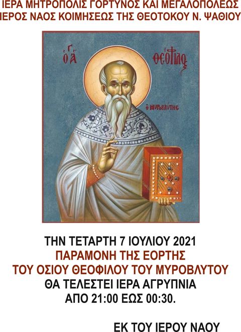 Την Τετάρτη 7 Ιουλίου , παραμονή της εορτής του Οσίου Θεοφίλου του Μυροβλήτου, θα τελεστεί Ιερά Αγρυπνία από τις 21:00 έως τις 00:30 , στον Ιερό Ναό Κοιμήσεως της Θεοτόκου στο Νέο Ψαθί.
