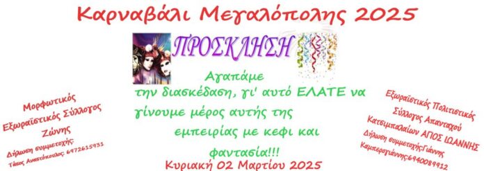 ΑρχικήΑΡΘΡΑΚάλεσμα από τους συλλόγους Ζώνης και Κατσίμπαλι για το Καρναβάλι Μεγαλόπολης