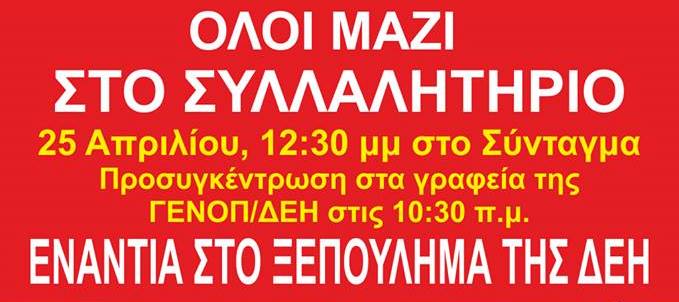 Η Συντονιστική αγωνιστική επιτροπή Μεγαλόπολης καλεί τους εργαζόμενους και τους πολίτες να συμμετέχουν στο συλλαλητήριο ενάντια στις πωλήσεις των μονάδων που θα γίνει στο Σύνταγμα στις 12:30 την Τετάρτη 25 Απριλίου, ημέρα ψήφισης του Νομοσχεδίου.
