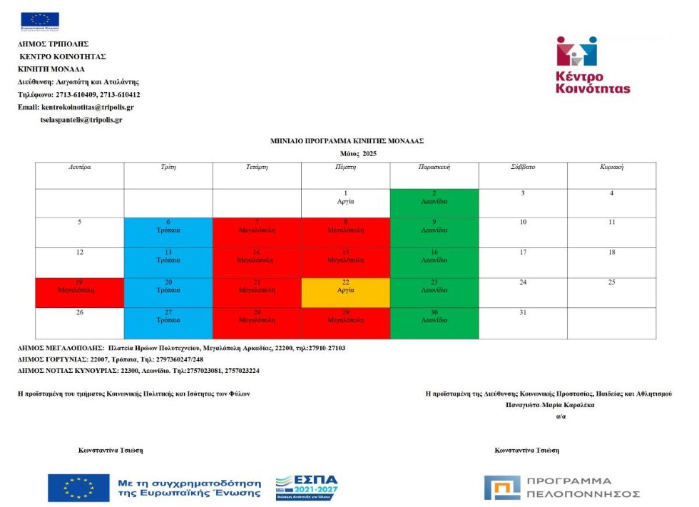 Για τον μήνα Μάιο, η κινητή μονάδα του Κέντρου Κοινότητας θα βρίσκεται στη Μεγαλόπολη με ωράριο 9:30 – 14:00 τις εξής μέρες: