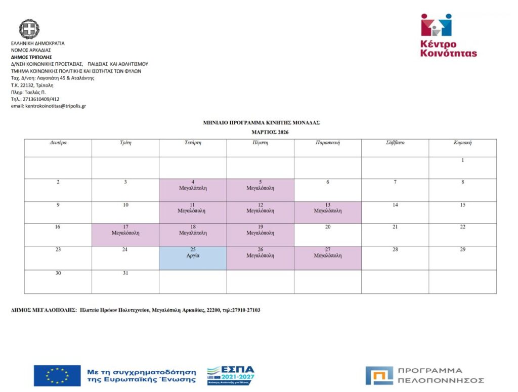 Για το μήνα Μάρτιο 2026 η Κινητή Μονάδα του Κέντρου Κοινότητας θα βρίσκεται στη Μεγαλόπολη με ωράριο 09:30 – 14:00 τις εξής μέρες: