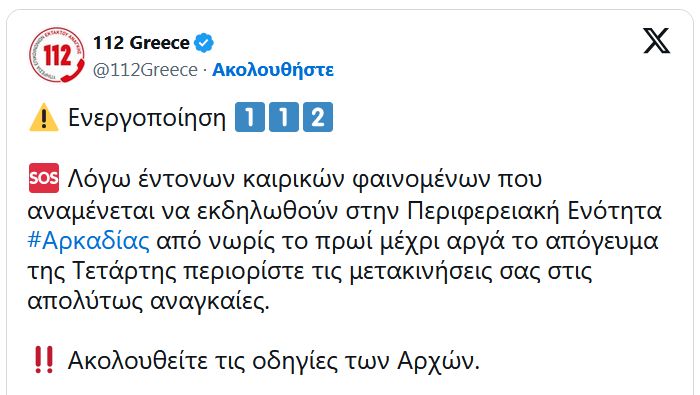Μήνυμα του 112 εστάλη σε κατοίκους της Αρκαδίας και άλλων νομών της Πελοποννήσου, καλώντας τους να περιορίσουν τις μετακινήσεις τους στις απολύτως αναγκαίες λόγω έντονων καιρικών φαινομένων που αναμένεται να εκδηλωθούν από νωρίς το πρωί αύριο μέχρι αργά το απόγευμα.
