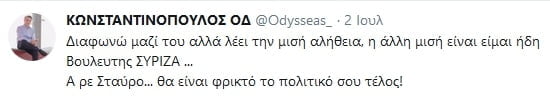 Η απάντηση του Οδυσσέα Κωνσταντινόπουλου ήρθε πάλι μέσω Twitter αφού όπως ανέφερε ο ALPHA δεν του έδωσε την δυνατότητα παρέμβασης.