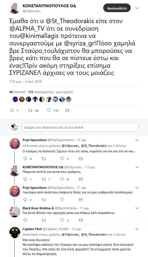 Στην διάρκεια της συνέντευξης, ο δημοσιογράφος ανέφερε ότι ο Οδυσσέας Κωνσταντινόπουλος προέβλεψε μέσω tweet ότι ο κ. Θεοδωράκης θα έχει φριχτό πολιτικό τέλος, τότε ο πρόεδρος του Ποταμιού ανέφερε το εξής απίστευτο: Δεν θέλω να απαντώ σε προσωπικές επιθέσεις που δείχνουν και μια κακία, η τελευταία μου συνάντηση με τον κ. Κωνσταντινόπουλο, ήταν στο εκτελεστικό όργανο του Κινήματος Αλλαγής που πρότεινε συνεργασία με τον ΣΥΡΙΖΑ!