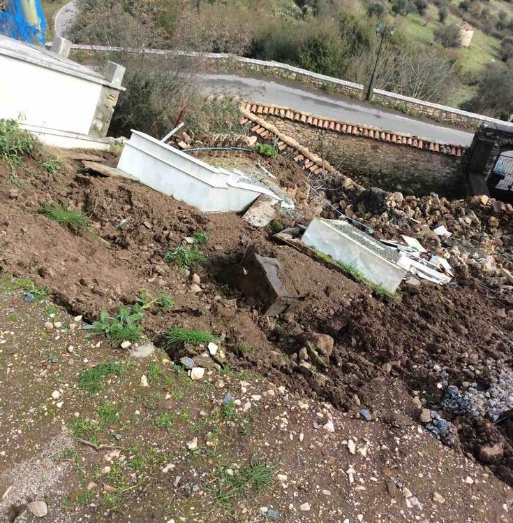 Αποτέλεσμα της κατάρρευσης της χωμάτινης πλευράς στην πίσω μεριά του νεκροταφείου της Καρύταινας ήταν να παρασυρθούν και τάφοι.