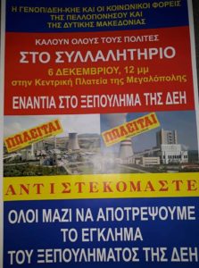 Αν στις 4 Δεκεμβρίου γεμίζει η πλατεία της Φλώρινας, αν στις 6 Δεκεμβρίου γεμίσει η πλατεία της Μεγαλόπολης και είναι όλοι έξω , μα όλοι, τότε να είστε σίγουροι ότι κανένας ιδιώτης δεν θα θελήσει να συμμετέχει σε μια διαδικασία που θα ξέρει ότι έχει απέναντι του την τοπική κοινωνία. Μόνο αυτό το στοιχείο , είναι ικανό να αποτρέψει το ξεπούλημα. Μέχρι σήμερα η Κυβέρνηση και τα συμφέροντα ξέρουν ότι εδώ στην Μεγαλόπολη η κοινωνία δεν αντιδρά και βλέπουν εύκολο το ξεπούλημα, γι αυτό έβαλαν τις μονάδες μέσα στην λίστα. Αν αυτό αλλάξει , να είστε βέβαιοι ότι αλλάζουν όλα. Για όσο διαρκεί η διαδικασία των MARKET TEST , οι αντιδράσεις μας μπορούν να ακυρώσουν τα πάντα! Δεν πρέπει αυτή την στιγμή να φανεί ότι υπάρχει διάθεση συζήτησης η διαπραγμάτευσης, ειδικά με αυτούς που ξεγέλασαν τους πολίτες . Και να θέλαμε δεν μπορούμε να συζητήσουμε με αναξιόπιστους και αφερέγγυους. Με αυτούς που αποδεδειγμένα έχουν παίξει παιχνίδια εναντίον ολόκληρης της κοινωνίας. Ας ερχόταν ο κ. Σταθάκης να συζητήσει πριν πάρει τις αποφάσεις του, ας φρόντιζε να αλλάξει τα κακώς κείμενα της ΔΕΗ η Κυβέρνηση τόσο καιρό που είναι στην εξουσία.