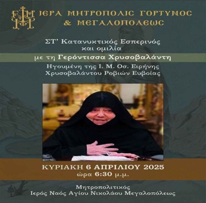 Η Γερόντισσα Χρυσοβαλάντη, Ηγουμένη της Ι.Μ.Αγ.Ειρήνης Χρυσοβαλάντου Ροβιών Ευβοίας, θα ομιλήσει επίκαιρα στον τελευταίο για φέτος Κατανυκτικό εσπερινό της Κυριακής 6 Απριλίου 2025 στις 6.30 το απόγευμα, στο Μητροπολιτικό Ναό του Αγ.Νικολάου Μεγαλοπόλεως