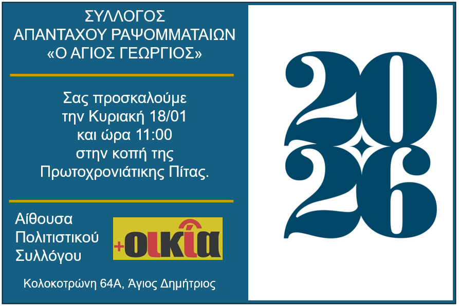 ΑρχικήΑΡΘΡΑΚοπή πίτας από τον Σύλλογο Απανταχού Ραψωμματαίων "Ο Άγιος Γεώργιος" την Κυριακή... Κοπή πίτας από τον Σύλλογο Απανταχού Ραψωμματαίων “Ο Άγιος Γεώργιος” την Κυριακή 18 Ιανουαρίου By kafeneio-megalopolis 8 Ιανουαρίου 2026 0 105 FacebookTwitterWhatsAppViberEmailΤυπώνω Ακολουθήστε τo Kafeneio-Megalopolis.gr στο Google News, για να μαθαίνετε πρώτοι όλα τα νέα από τη Μεγαλόπολη και την ευρύτερη περιοχή. Κοπή πίτας από τον Σύλλογο Απανταχού Ραψωμματαίων “Ο Άγιος Γεώργιος” την Κυριακή 18 Ιανουαρίου Σχόλια με λογαριασμό Facebook TagsΑΡΘΡΑΣΥΛΛΟΓΟΙ FacebookTwitterWhatsAppViberEmailΤυπώνω Ακολουθήστε τo Kafeneio-Megalopolis.gr στο Google News, για να μαθαίνετε πρώτοι όλα τα νέα από τη Μεγαλόπολη και την ευρύτερη περιοχή. Προηγούμενο άρθροΚακοκαιρία: Πορτοκαλί προειδοποίηση για τη νότια Πελοπόννησο – Συνεδρίασε το Συντονιστικό Όργανο Πολιτικής ΠροστασίαςΕπόμενο άρθροΚλειστή η νέα και η παλιά Εθνική οδός για Αθήνα – Μέσω Άστρους η μετάβαση kafeneio-megalopolis RELATED ARTICLES ΑΡΘΡΑ Δημοτική Χορωδία Πυλάδης – Ανασκόπηση χρονιάς kafeneio-megalopolis - 9 Ιανουαρίου 2026 ΑΡΘΡΑ Το Επιμελητήριο Αρκαδίας ανοίγει τον δρόμο για το CERN σε μαθητές Λυκείων της Αρκαδίας. Ενημερωτική Εκδήλωση δια ζώσης & Live Streaming kafeneio-megalopolis - 9 Ιανουαρίου 2026 ΑΘΛΗΤΙΣΜΟΣ Ο Αντώνης Κούτρης προπονητής στον Πολύβιο kafeneio-megalopolis - 9 Ιανουαρίου 2026 11,781ΥποστηρικτέςΚάντε Like1,680ΑκόλουθοιΑκολουθήστε6,038ΣυνδρομητέςΓίνετε συνδρομητής Προτεινόμενα Άρθρα Τα 10 πιο δημοφιλή άρθρα και βίντεο του 2025 από το Καφενείο Μεγαλόπολης Μιχόπουλος: Ανακοίνωση 19 έργων – Σε 2 χρόνια καταφέραμε να βάλουμε το Δήμο μας σε Αλλαγή Πορείας... FACEBOOK ΑΡΘΡΑ Δημοτική Χορωδία Πυλάδης – Ανασκόπηση χρονιάς Ανασκόπηση της χορωδίας μας για την χρονιά που έφυγε...καλή χρονιά σε όλο τον κόσμο... 9 Ιανουαρίου 2026 ΑΡΘΡΑ Το Επιμελητήριο Αρκαδίας ανοίγει τον δρόμο για το CERN σε μαθητές Λυκείων της Αρκαδίας. Ενημερωτική Εκδήλωση δια ζώσης & Live Streaming Το Επιμελητήριο Αρκαδίας διοργανώνει ενημερωτική εκδήλωση με αφορμή την εκπαιδευτική επίσκεψη που προγραμματίζει στο... 9 Ιανουαρίου 2026 ΑΘΛΗΤΙΣΜΟΣ Ο Αντώνης Κούτρης προπονητής στον Πολύβιο Η ομάδα του Πολυβίου ανακοινώνει την συνεργασία της με τον προπονητή Αντώνη Κούτρη. Η... 9 Ιανουαρίου 2026 ΑΘΛΗΤΙΣΜΟΣ Ανακοινώσεις μεταγραφών από την Δόξα Μεγαλόπολης Μεταγραφικό ντεμαράζ επικρατεί τις τελευταίες ώρες στην Δόξα Μεγαλόπολης, καθώς προσθέτει στο ενεργητικό της... 9 Ιανουαρίου 2026 ΠΡΟΣΦΑΤΑ ΣΧΟΛΙΑ Ασημακόπουλος Ιωάννης επί Παρουσίαση βιβλίου “Τα Αρκαδικά Μονοπάτια και τα Apollo Trails στο Λύκαιο Όρος, το ιερό βουνό των Αρκάδων” το Σάββατο 19 Αυγούστου στη Μεγαλόπολη Ασημακόπουλος Ιωάννης επί Νίκας: Προχωρεί η διαδικασία για το φωτοβολταϊκό των 2.000 στρεμμάτων στη Μεγαλόπολη που θα χρησιμοποιηθεί από τους αγρότες της Μεσσηνίας και της Αργολίδας Γιώργος Αδαμόπουλος επί Ερώτημα προς την αρμόδια Περιφέρεια Πελοποννήσου για την ασφαλή λειτουργία της “νέας” Γέφυρας του Αλφειού στην Καρύταινα Κατριβανος επί Ερώτημα προς την αρμόδια Περιφέρεια Πελοποννήσου για την ασφαλή λειτουργία της “νέας” Γέφυρας του Αλφειού στην Καρύταινα