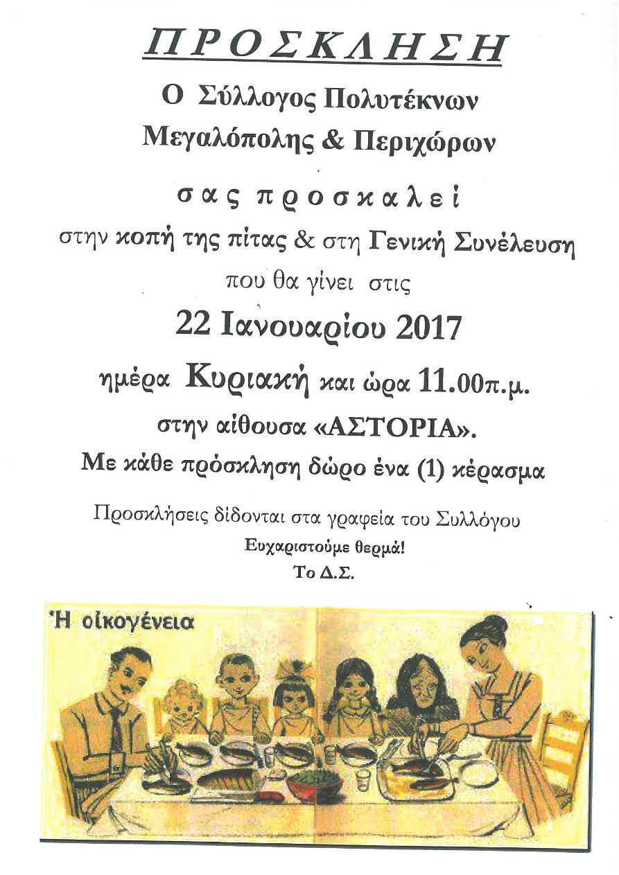 Ο Σύλλογος Πολυτέκνων Μεγαλόπολης και περιχώρων σας προσκαλεί στην κοπή της πίτας του και στην Γενική Συνέλευση που θα γίνει την Κυριακή 22 Ιανουαρίου στις 11 το πρωί στο κέντρο Αστόρια.