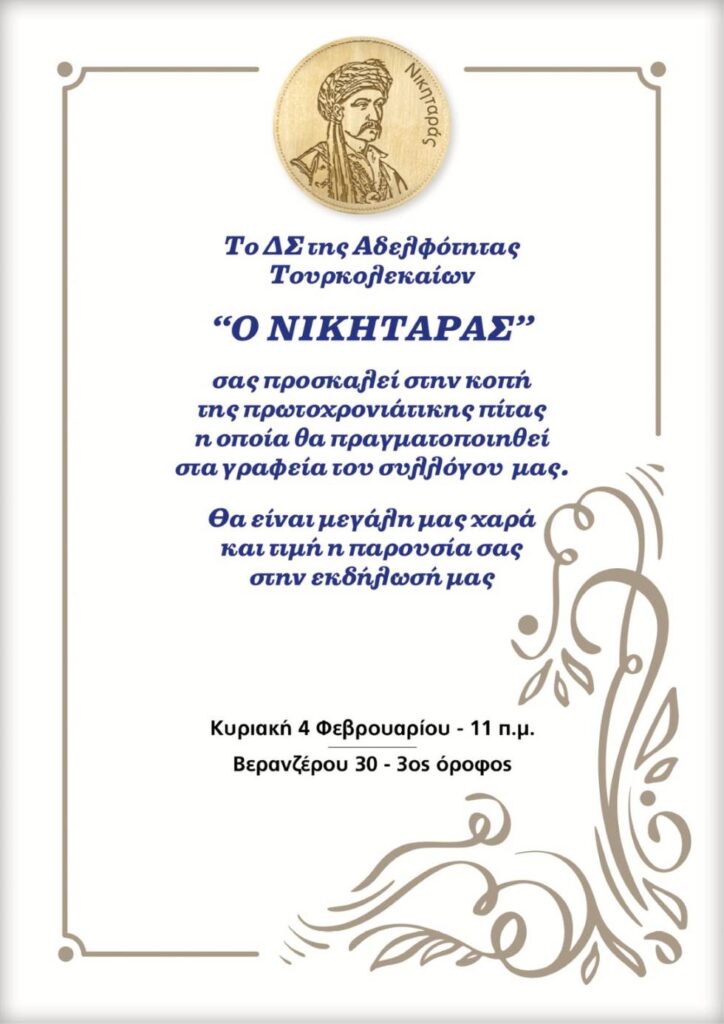 To Διοικητικό Συμβούλιο της Αδελφότητας Τουρκολεκαίων «Ο ΝΙΚΗΤΑΡΑΣ», σας προσκαλεί στην κοπή της πρωτοχρονιάτικης πίτας, η οποία θα πραγματοποιηθεί στα γραφεία του Συλλόγου μας (Βερανζέρου 30, Αθήνα) την Κυριακή 4 Φεβρουαρίου και ώρα 11:00