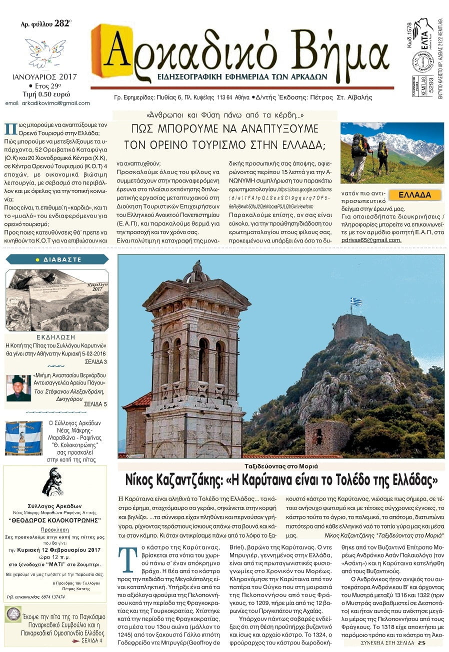 Κυκλοφόρησε η εφημερίδα “Αρκαδικό Βήμα” Ιανουάριος 2017, με θέματα: Έρευνα “Πως μπορούμε να αναπτύξουμε τον ορεινό τουρισμό στην Ελλάδα”, Νίκος Καζαντζάκης: “Η Καρύταινα είναι το Τολέδο της Ελλάδας”.