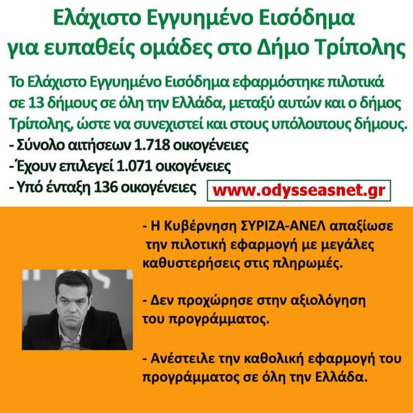 Με ανακοίνωσή του στην προσωπική του ιστοσελίδα, ο υποψήφιος βουλευτής του ΠαΣοΚ στην Αρκαδία κ. Οδυσσέας Κωνσταντινόπουλος ψέγει την απελθούσα κυβέρνηση ΣΥΡΙΖΑ-ΑΝΕΛ, διότι απαξίωσε, όπως αναφέρει σε ανακοίνωσή του, την εφαρμογή του προγράμματος για το Ελάχιστο Εγγυημένο Εισόδημα, το οποίο είχε εφαρμοστεί πιλοτικά και στον Δήμο Τρίπολης, με σκοπό να ανακουφίσει περίπου δύο χιλιάδες οικογένειες.