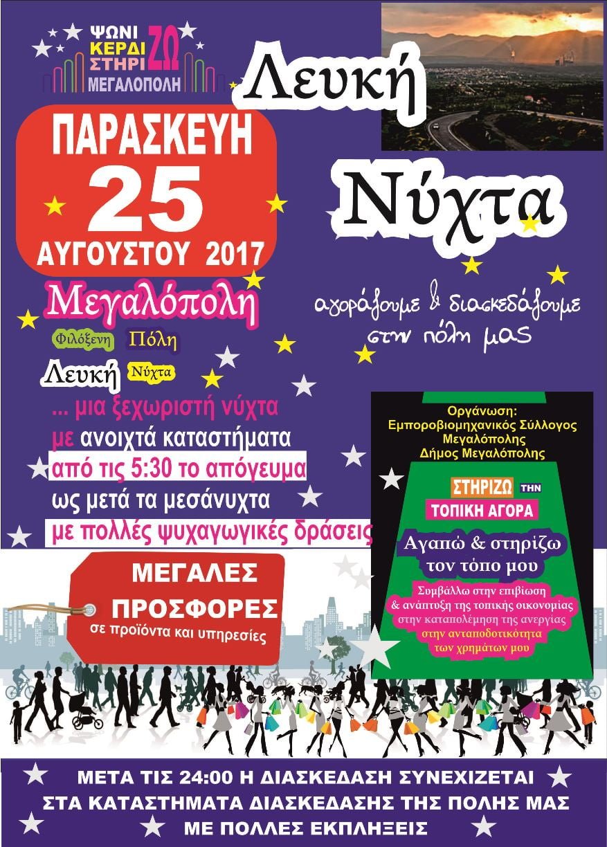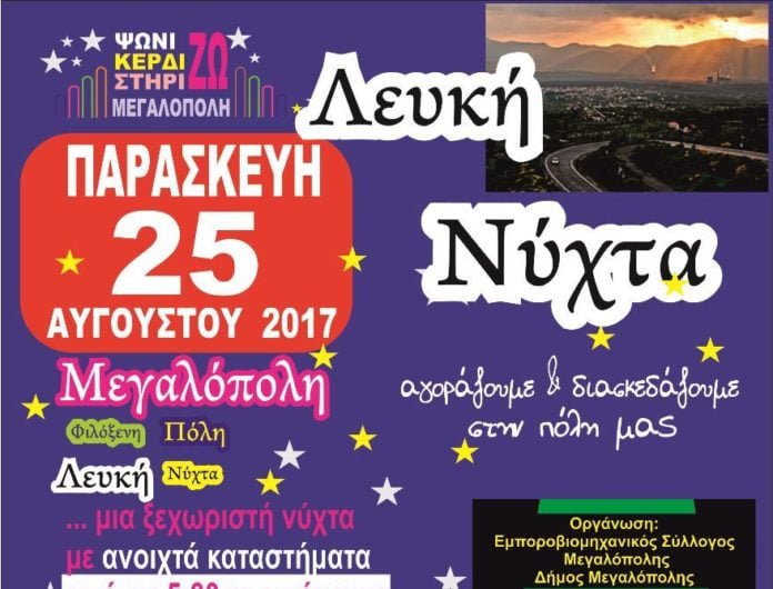 Την Παρασκευή 25 Αυγούστου ο Εμπορικός Σύλλογος Μεγαλόπολης διοργανώνει Λευκή Νύχτα, με ανοιχτά καταστήματα από τις 17:30 έως μετά τα μεσάνυχτα.