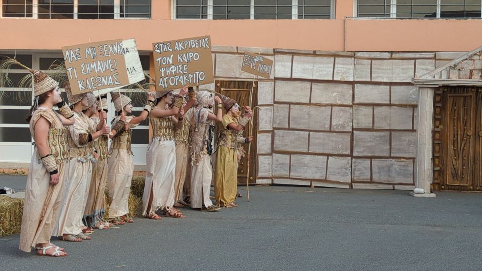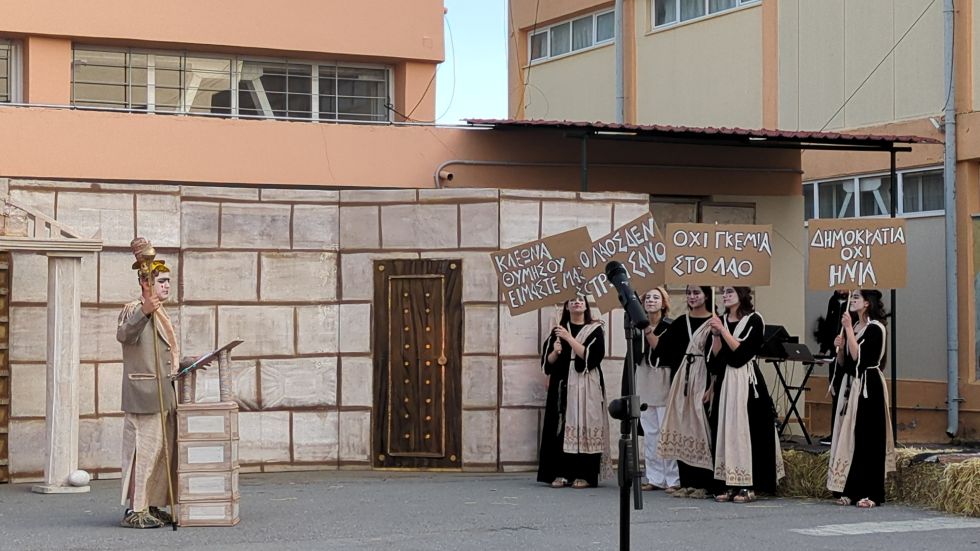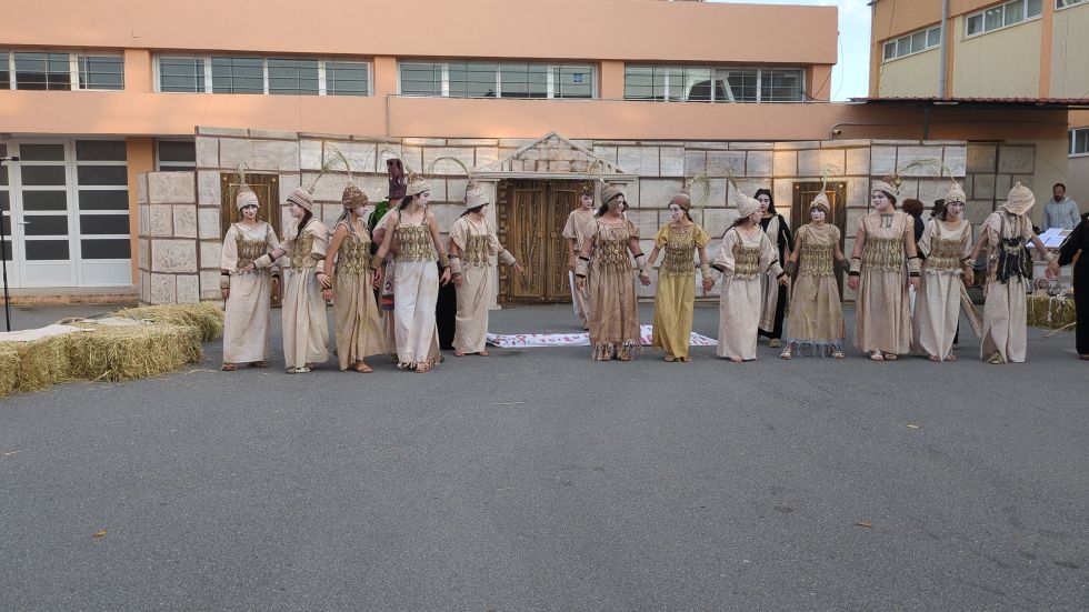 Η θεατρική ομάδα του Γυμνασίου Μεγαλόπολης εργάστηκε σκληρά ,πρόθυμα και με χαρά δίνοντας τον καλύτερο εαυτό τους επί σκηνής και αποσπώντας το θερμό χειροκρότημα του κοινού ,αποδίδοντας τα πάντα επίκαιρα πολιτικά και φιλοσοφικά μηνύματα του Αριστοφάνη.