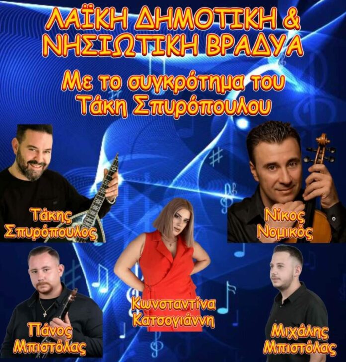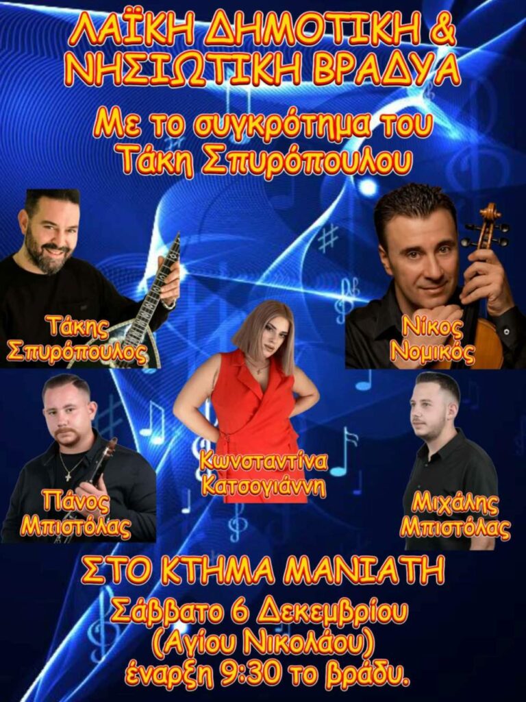 Λαϊκή – Δημοτική – Νησιωτική βραδιά το Σάββατο 6 Δεκεμβρίου στο Κτήμα Μανιάτη στην Μεγαλόπολη Αρκαδίας.
