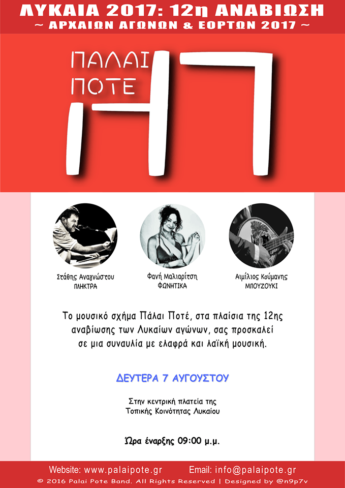 Σήμερα Δευτέρα 7 Αυγούστου 2017 θα πραγματοποιηθεί Μουσική βραδιά με το μουσικό συγκρότημα «ΠΑΛΑΙ ΠΟΤΕ» σε έντεχνο – λαϊκό πρόγραμμα: στην κεντρική πλατεία της τοπικής κοινότητας Λυκαίου.