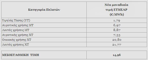 Η μεσοσταθμική τιμή του ΕΤΜΕΑΡ καθορίστηκε σε 14,96 ευρώ ανά μεγαβατώρα, από 9,3 ευρώ που ήταν στο πρώτο εξάμηνο (προκύπτει δηλαδή μέση αύξηση 60%). Έγιναν ωστόσο και μειώσεις για τις βιομηχανίες που τροφοδοτούνται από το δίκτυο υψηλής τάσης.