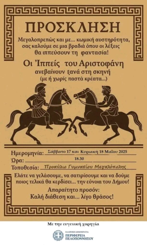 Οι μαθητές του Γυμνασίου Μεγαλόπολης , παρουσιάζουν Τους «Ιππείς» του Αριστοφάνη, το Σάββατο 17 και την Κυριακή 18/5, στις 18:30 στο προαύλιο χώρο του Γυμνασίου Μεγαλόπολης.