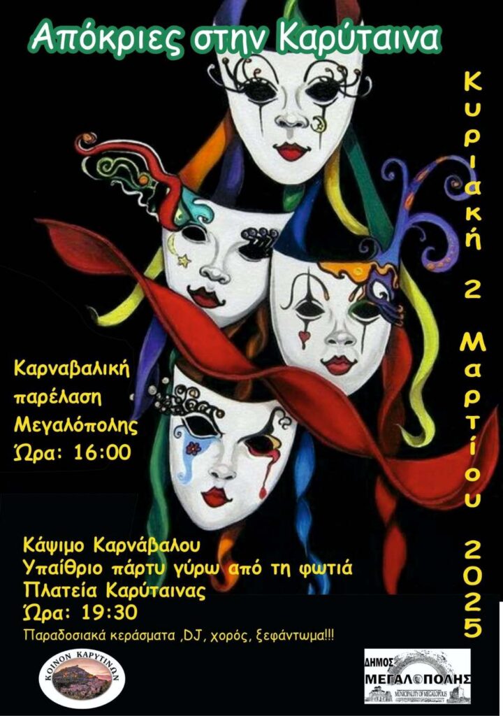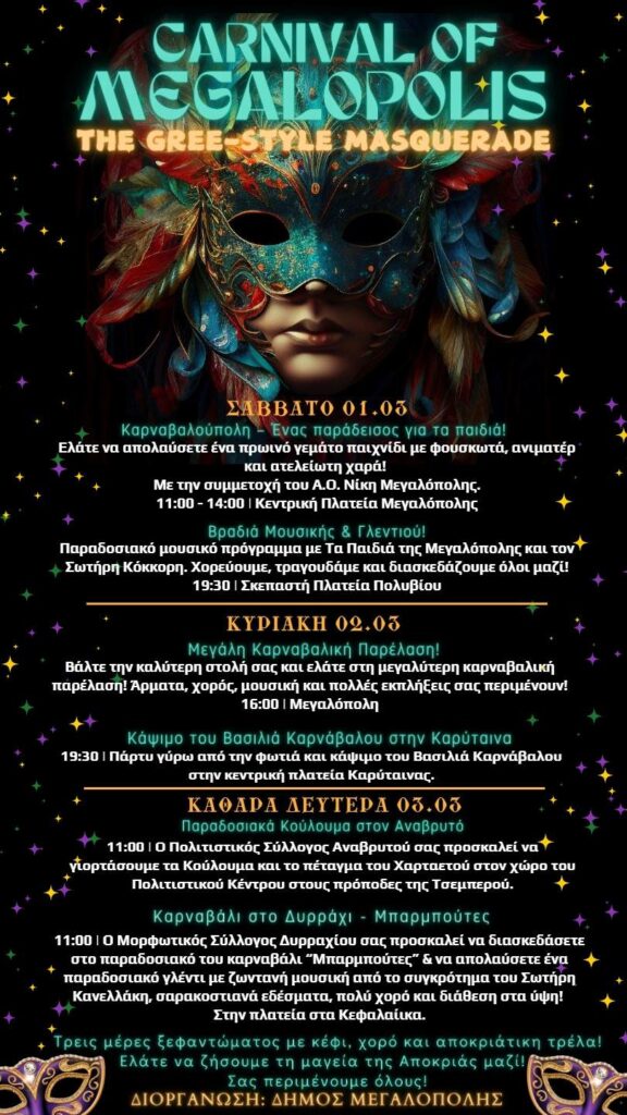 Ο Δήμος Μεγαλόπολης σας ενημερώνει για τις προγραμματισμένες καρναβαλικές εκδηλώσεις.
