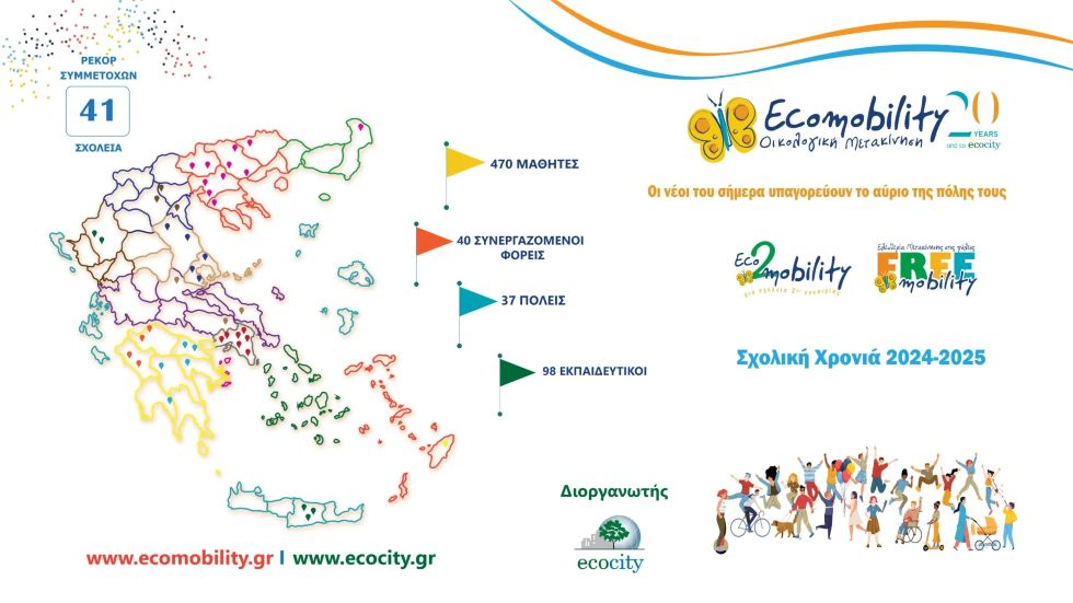 45 σχολεία από 40 διαφορετικές πόλεις συμμετέχουν στο ECOMOBILITY 2024-25, και στις παράλληλες δράσεις FREEMOBILITY και ECO2MOBILITY. Το ECOMOBILITY διοργανώνεται από το ECOCITY, μη κερδοσκοπικό οργανισμό που λειτουργεί σε εθελοντική βάση και εστιάζει στο αστικό περιβάλλον, και στοχεύει στην ενημέρωση και στην ευαισθητοποίηση μαθητών, πολιτών και τοπικής αυτοδιοίκησης σε θέματα βιώσιμης κινητικότητας, κλιματικά ουδέτερων πόλεων, μικροκινητικότητας, ανάκτησης του δημοσίου χώρου και ελεύθερης πρόσβασης.