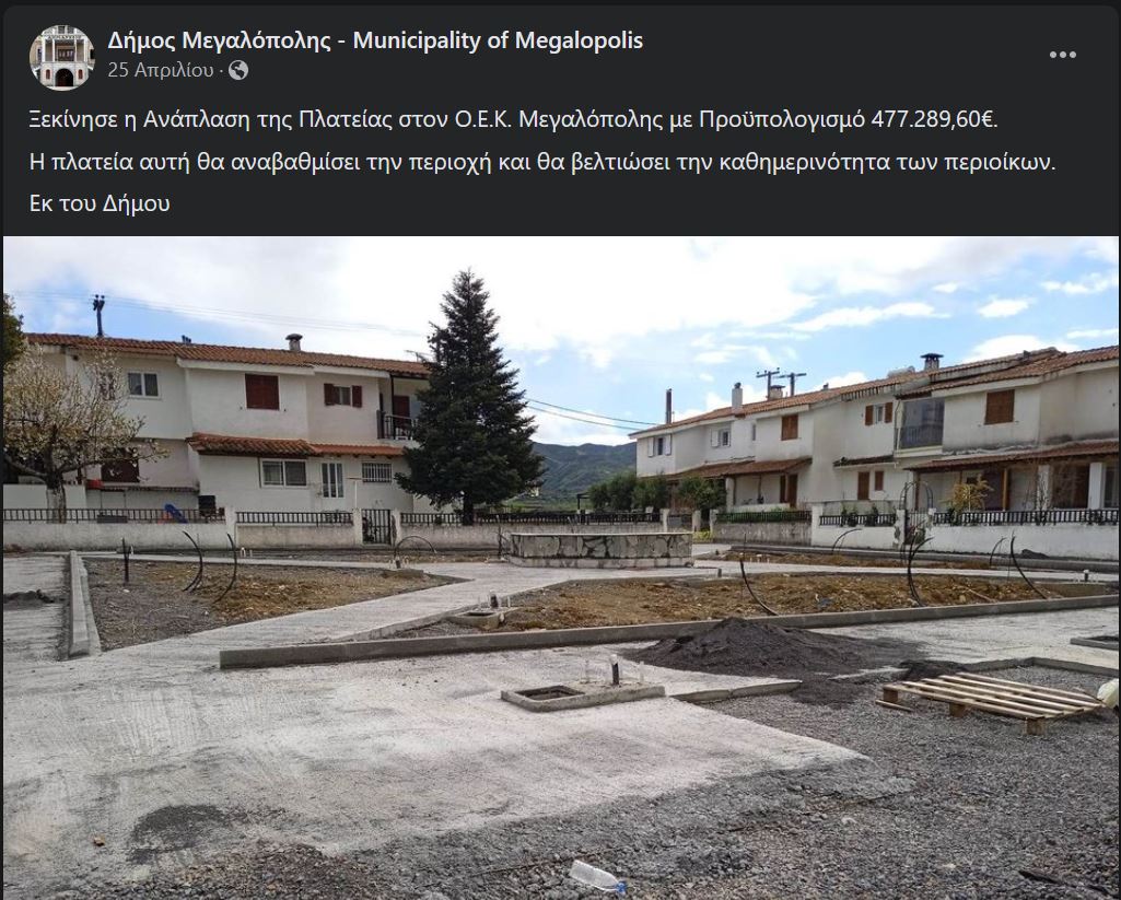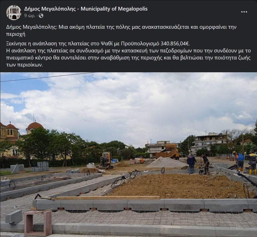 Ο Δήμος Μεγαλόπολης με 2 δελτία τύπου και σχετικές αναρτήσεις στην σελίδα στο Facebook, ενημερώνει τους πολίτες ότι ξεκίνησαν 2 έργα , οι αναπλάσεις των πλατειών ΟΕΚ και ΨΑΘΙΟΥ Μεγαλόπολης.