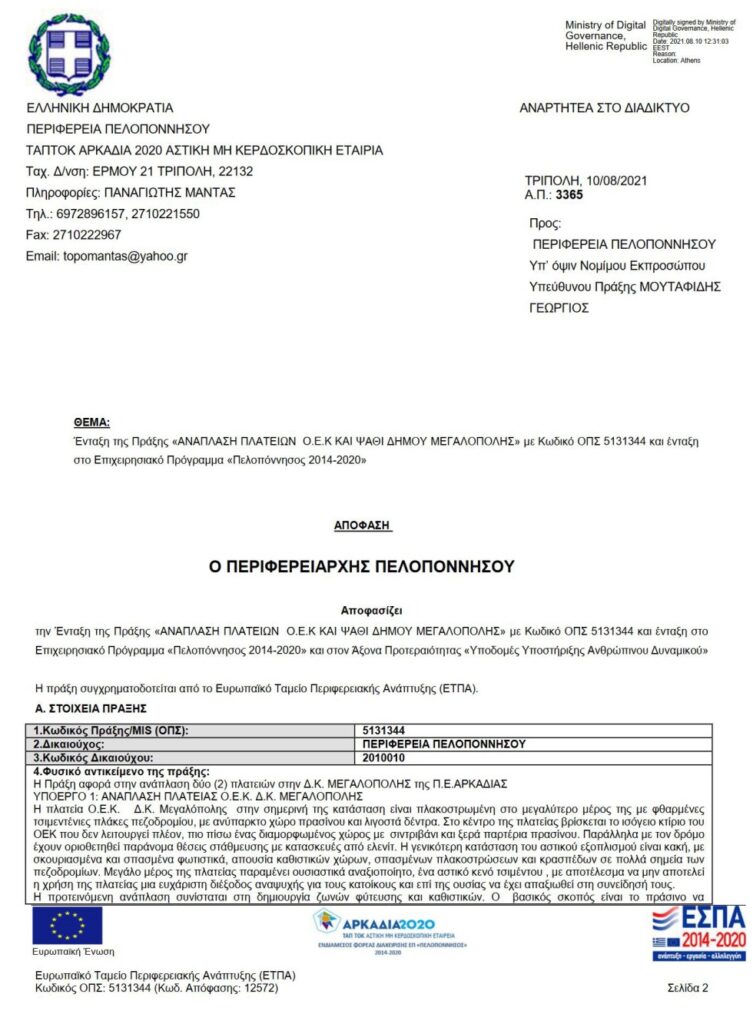 δείτε τις σχετικές δημοσιεύσεις του Δήμου Μεγαλόπολης και την απόφαση της Περιφέρειας: