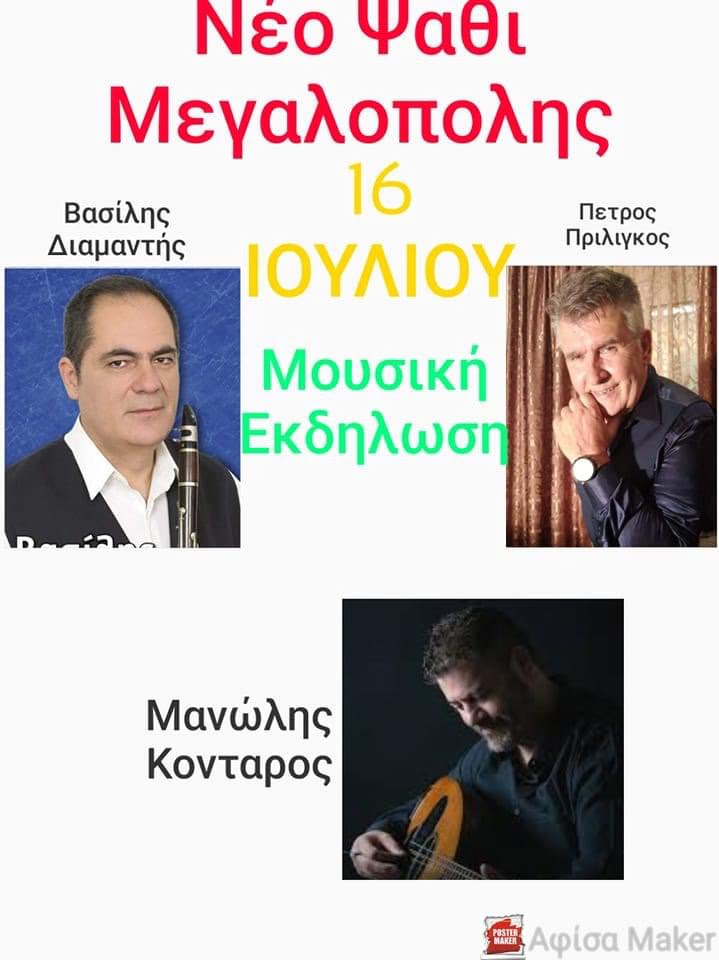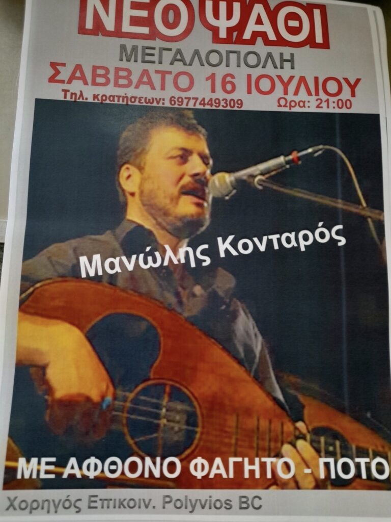 Το Σάββατο 16 Ιουλίου έρχεται στην Μεγαλόπολη ο Μανώλης Κονταρός , σε μια εκδήλωση που θα γίνει στην πλατεία στο Νέο Ψαθί.