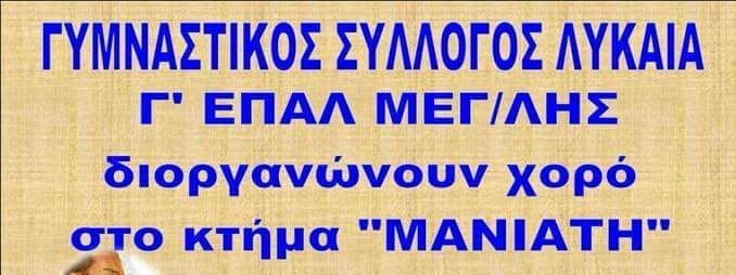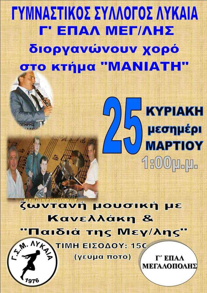 Την Κυριακή 25 Μαρτίου και ωρα 13:00 στο κτήμα ΜΑΝΙΑΤΗ , θα πραγματοποιηθεί χορός που διοργανώνει ο Γ.Σ.Μ. ΛΥΚΑΙΑ και η Γ’ ΤΑΞΗ του ΕΠΑΛ ΜΕΓΑΛΟΠΟΛΗΣ.