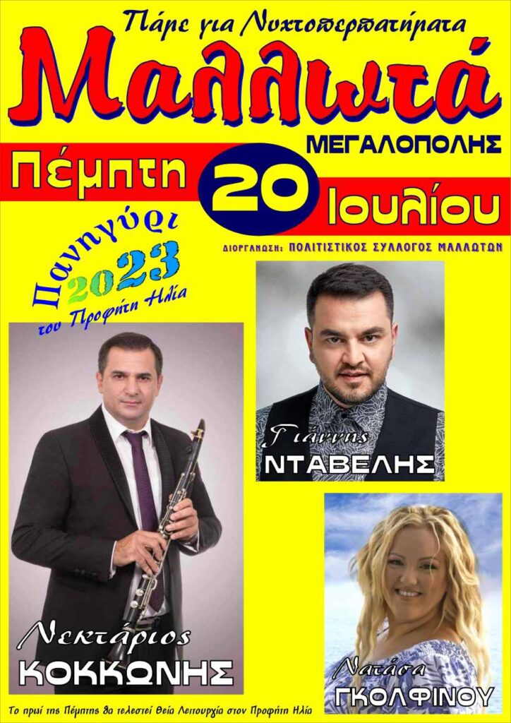 Ο Πολιτιστικός Σύλλογος Μαλλωτών διοργανώνει την Πέμπτη 20 Ιουλίου 2023 το Πανηγύρι του Προφήτη Ηλία στον προαύλιο χώρο του Πολιτιστικού Κέντρου Μαλλωτών.
