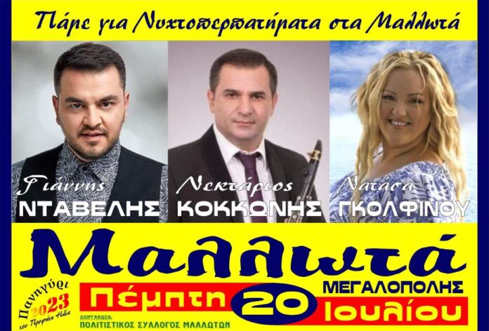 Ο Πολιτιστικός Σύλλογος Μαλλωτών διοργανώνει την Πέμπτη 20 Ιουλίου 2023 το Πανηγύρι του Προφήτη Ηλία στον προαύλιο χώρο του Πολιτιστικού Κέντρου Μαλλωτών.