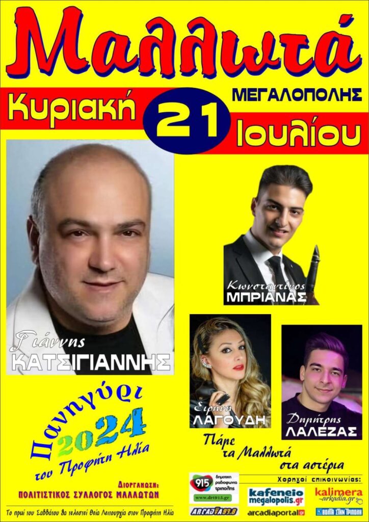 Την Κυριακή 21 Ιουλίου 2024 σας περιμένουμε στο μεγάλο Πανηγύρι στα Μαλλωτά Μεγαλόπολης που διοργανώνει ο Πολιτιστικός Σύλλογος Μαλλωτών.