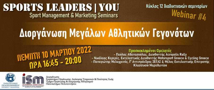 Το Εργαστήριο Οργάνωσης, Διοίκησης Υπηρεσιών & Ποιότητας Ζωής του Τμήματος Οργάνωσης & Διαχείρισης Αθλητισμού του Πανεπιστημίου Πελοποννήσου διοργανώνει διαδικτυακή εκδήλωση την Πέμπτη 10 Μαρτίου 2022, με θέμα “Διοργάνωση Μεγάλων Αθλητικών Γεγονότων”.