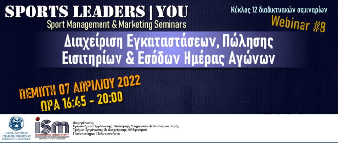 Το Εργαστήριο Οργάνωσης, Διοίκησης Υπηρεσιών & Ποιότητας Ζωής του Τμήματος Οργάνωσης & Διαχείρισης Αθλητισμού του Πανεπιστημίου Πελοποννήσου διοργανώνει διαδικτυακή εκδήλωση την Πέμπτη 7 Απριλίου 2022, με θέμα “Διαχείριση Εγκαταστάσεων, Πώλησης Εισιτηρίων & Εσόδων Ημέρας Αγώνων”.