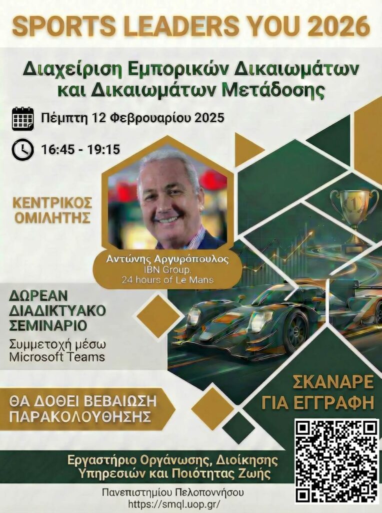 Το Εργαστήριο Οργάνωσης, Διοίκησης Υπηρεσιών και Ποιότητας Ζωής του Τμήματος Οργάνωσης και Διαχείρισης Αθλητισμού του Πανεπιστημίου Πελοποννήσου ξεκινά νέο κύκλο δωρεάν διαδικτυακών σεμιναρίων για στελέχη του αθλητισμού.