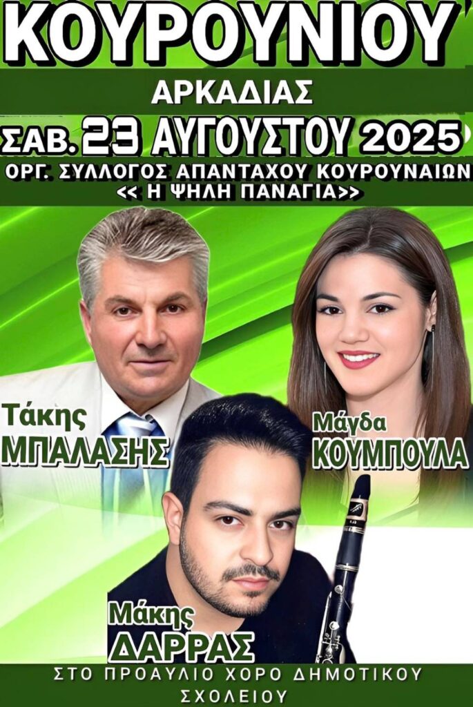 Ο Πολιτιστικός Σύλλογος των Απανταχού Κουρουναίων <Η Ψηλή Παναγιά> διοργανώνει και φέτος παραδοσιακό πανηγύρι το Σάββατο 23 Αυγούστου το βράδυ στον προαύλιο χώρο του Δημοτικού Σχολείου Κουρουνιού.