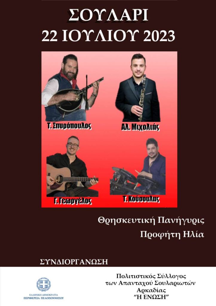 Ο Πολιτιστικός Σύλλογος των Απανταχού Σουλαριωτών Αρκαδίας – Η ΕΝΩΣΗ διοργανώνει πανηγύρι στις 22 Ιουλίου.