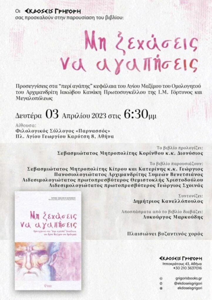 Την Δευτέρα 3 Απριλίου θα γίνει η παρουσίαση του νέου βιβλίου του Αρχιμανδρίτη Ιάκωβου Κανάκη “Μην ξεχάσεις να αγαπήσεις”, στην αίθουσα Φιλολογικός Σύλλογος Παρνασσός στην πλατεία Αγίου Γεωργίου Καρύτση 8 στην Αθήνα.