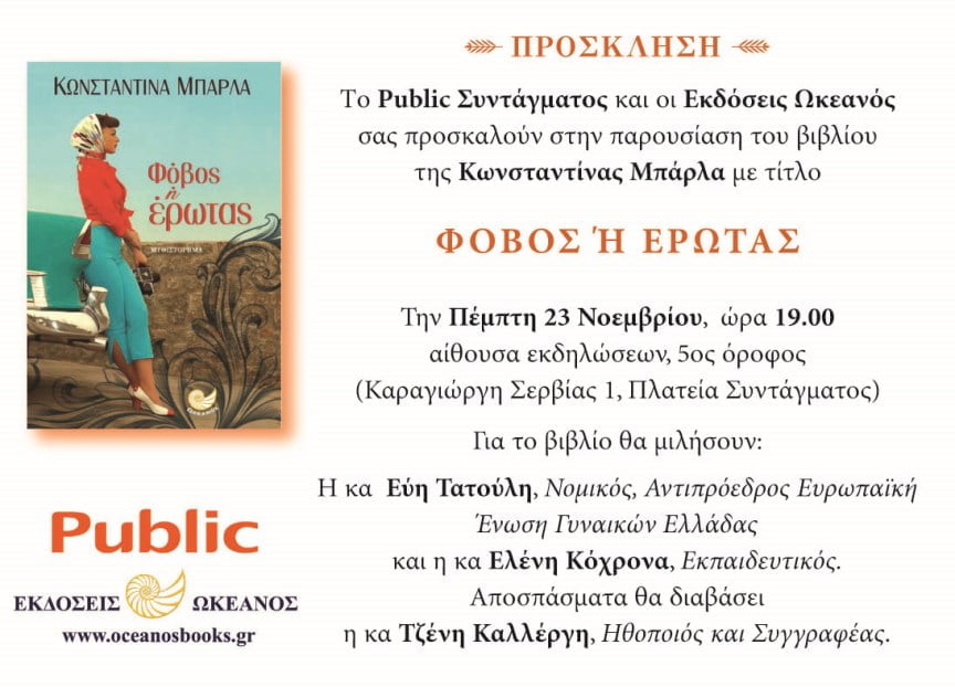 H Κωνσταντίνα Μπάρλα σας περιμένει όλους στο Public Συντάγματος την Πέμπτη 23 Νοεμβρίου, στην παρουσίαση του νέου της μυθιστορήματος “Φόβος ή Έρωτας” που κυκλοφορεί από τις εκδόσεις Ωκεανός.