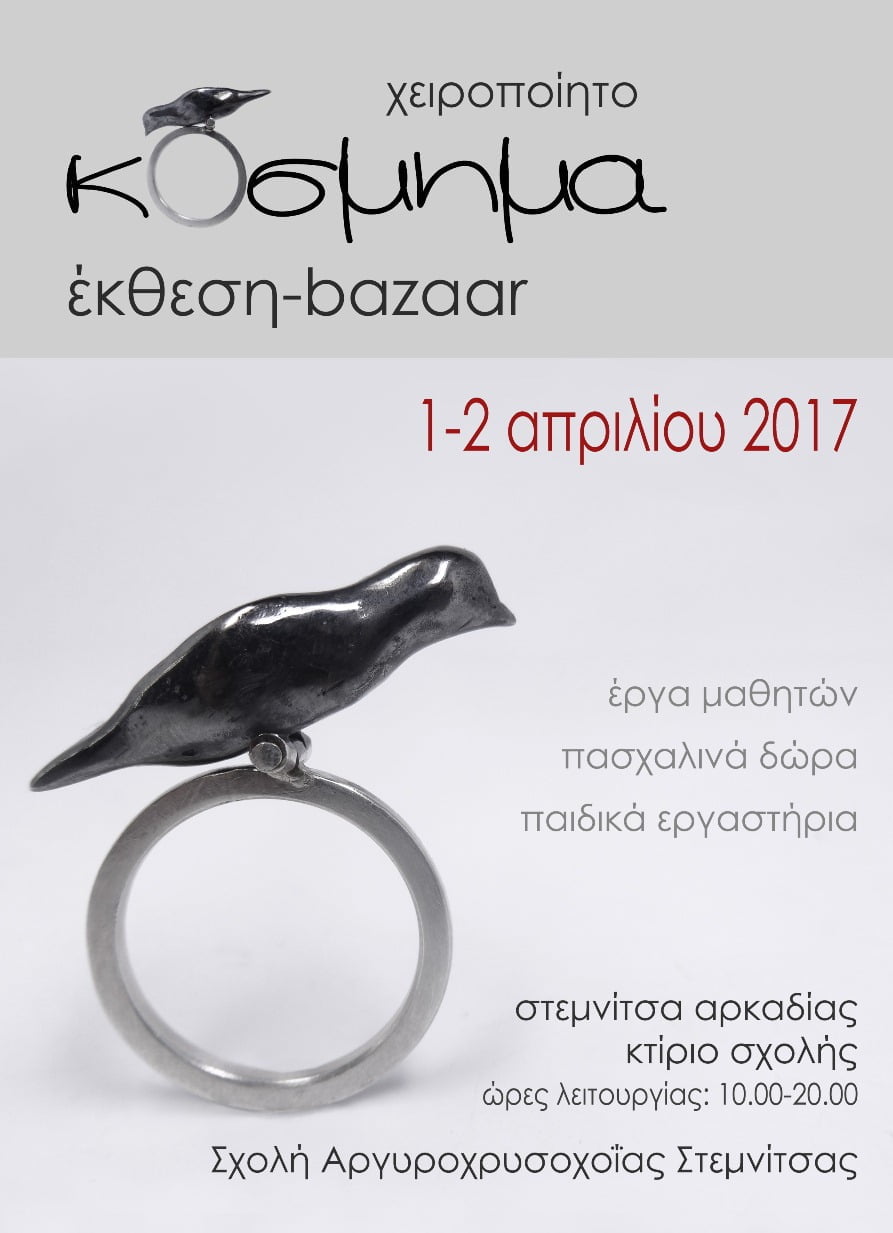 Η Σχολή Αργυροχρυσοχοΐας Στεμνίτσας σας προσκαλεί στο Πασχαλινό Bazaar της, με κοσμήματα μαθητών, πασχαλινά δώρα και παιδικά εργαστήρια, που θα πραγματοποιηθεί στις 1-2 Απριλίου 2017.