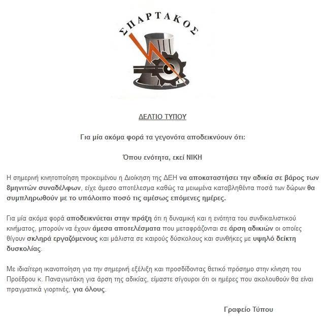 Βρήκαμε ανακοίνωση του Σωματείου ΣΠΑΡΤΑΚΟΣ στην οποία αναφέρεται: