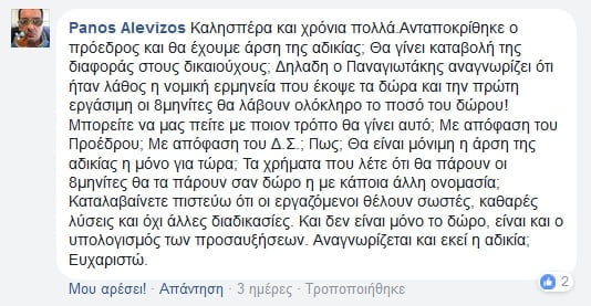 “Καλησπέρα και χρόνια πολλά.Ανταποκρίθηκε ο πρόεδρος και θα έχουμε άρση της αδικίας; Θα γίνει καταβολή της διαφοράς στους δικαιούχους; Δηλαδη ο Παναγιωτάκης αναγνωρίζει ότι ήταν λάθος η νομική ερμηνεία που έκοψε τα δώρα και την πρώτη εργάσιμη οι 8μηνίτες θα λάβουν ολόκληρο το ποσό του δώρου! Μπορείτε να μας πείτε με ποιον τρόπο θα γίνει αυτό; Με απόφαση του Προέδρου; Με απόφαση του Δ.Σ.; Πως; Θα είναι μόνιμη η άρση της αδικίας η μόνο για τώρα; Τα χρήματα που λέτε ότι θα πάρουν οι 8μηνίτες θα τα πάρουν σαν δώρο η με κάποια άλλη ονομασία; Καταλαβαίνετε πιστεύω ότι οι εργαζόμενοι θέλουν σωστές, καθαρές λύσεις και όχι άλλες διαδικασίες. Και δεν είναι μόνο το δώρο, είναι και ο υπολογισμός των προσαυξήσεων. Αναγνωρίζεται και εκεί η αδικία; Ευχαριστώ.”