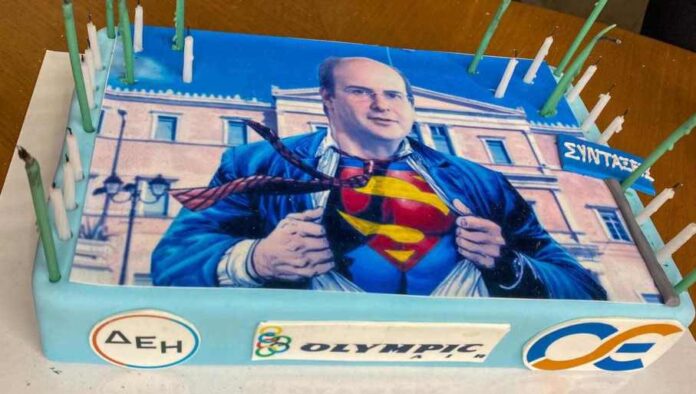 Σήμερα, τον γύρο του Διαδικτύου κάνει η τούρτα του Χατζηδάκη για τα γενέθλιά του. Ο κ. Χατζηδάκης, ο οποίος έχει εργαστεί μόνον ως πολιτικός σε όλη του τη ζωή, έσβησε τα πράσινα και λευκά κεράκια του (προσδοκά κι αυτός επιστροφή του ΠαΣοΚ του ορθόδοξου, άραγε..) σε μια τούρτα όπου πίσω προβάλλεται η -απαραίτητη, από ό,τι καταλαβαίνουμε, στις τούρτες των μελών του κυβερνώντος κόμματος που κάθονται στα έδρανά της- Βουλή, και μπροστά αυτός, αγέρωχος να ανοίγει το πουκάμισο και από μέσα να ξεπροβάλλει το σήμα του υπερήρωα Σούπερμαν. Κάτω, τα σήμερα της Ολυμπιακής, του ΟΣΕ και της ΔΕΗ, και πιο δίπλα, μια ετικέτα από ζαχαρόπαστα που λέει επάνω «ΣΥΝΤΑΞΕΙΣ».