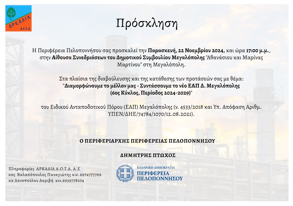 Πρόκειται για διαβούλευση η οποία αφορά την συγκρότηση του 6ου κύκλου του Ειδικού Ανταποδοτικού Πόρου Μεγαλόπολης, για την περίοδο 2024-2029.