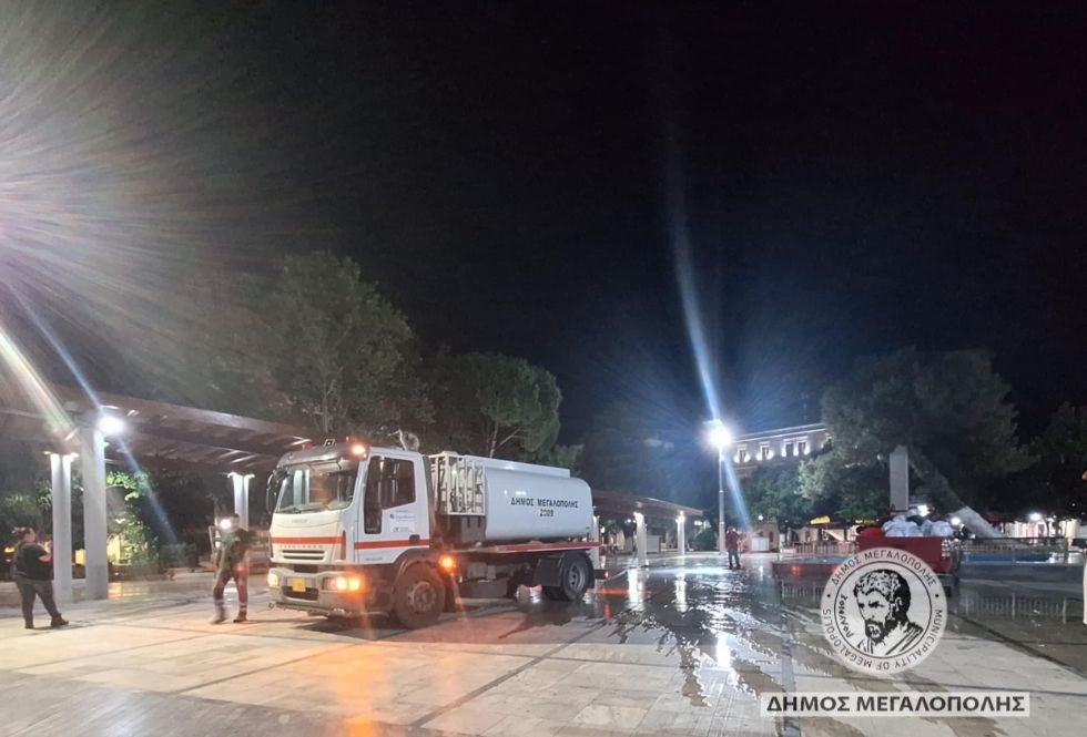 Πλύσιμο των κάδων απορριμμάτων και της κεντρικής πλατείας Μεγαλόπολης