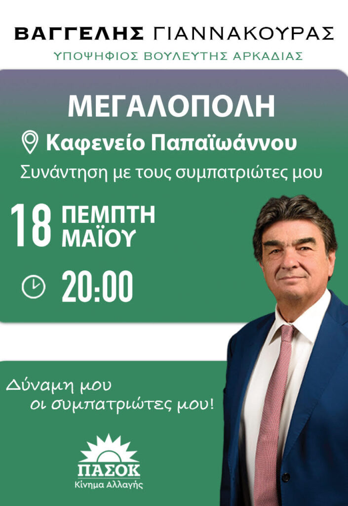 Πολιτική ομιλία θα πραγματοποιήσει ο Υποψήφιος Βουλευτής ΠΑΣΟΚ – ΚΙΝΑΛ Αρκαδίας Βαγγέλης Γιαννακούρας στη Μεγαλόπολη.