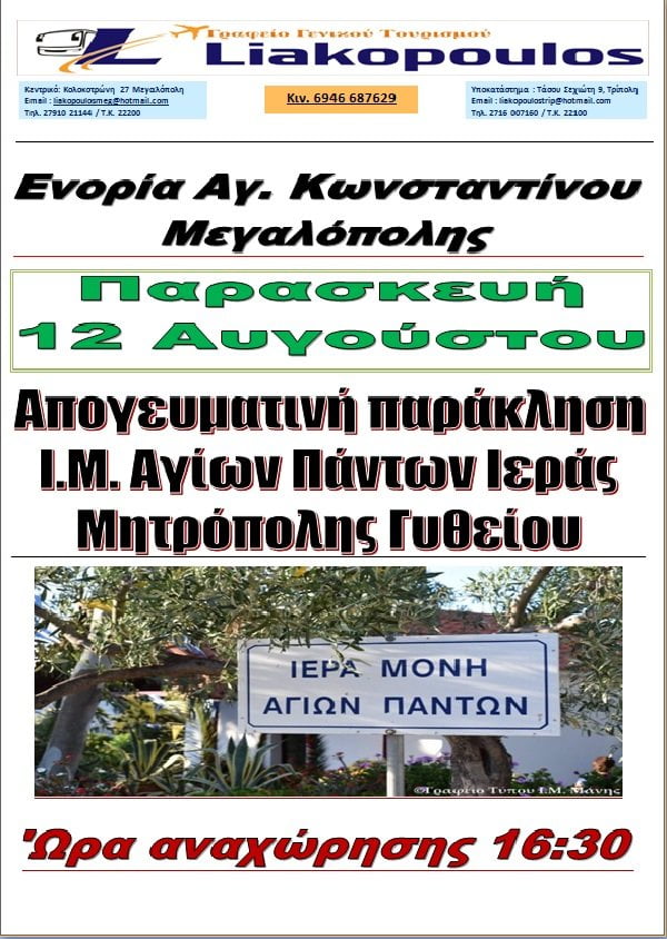 Ο Ιερός Ναός Αγίου Κωνσταντίνου Μεγαλόπολης διοργανώνει προσκυνηματική εκδρομή στις 12 Αυγούστου στην Ιερά Μονή Αγίων Πάντων της Ιεράς Μητροπόλεως Γυθείου