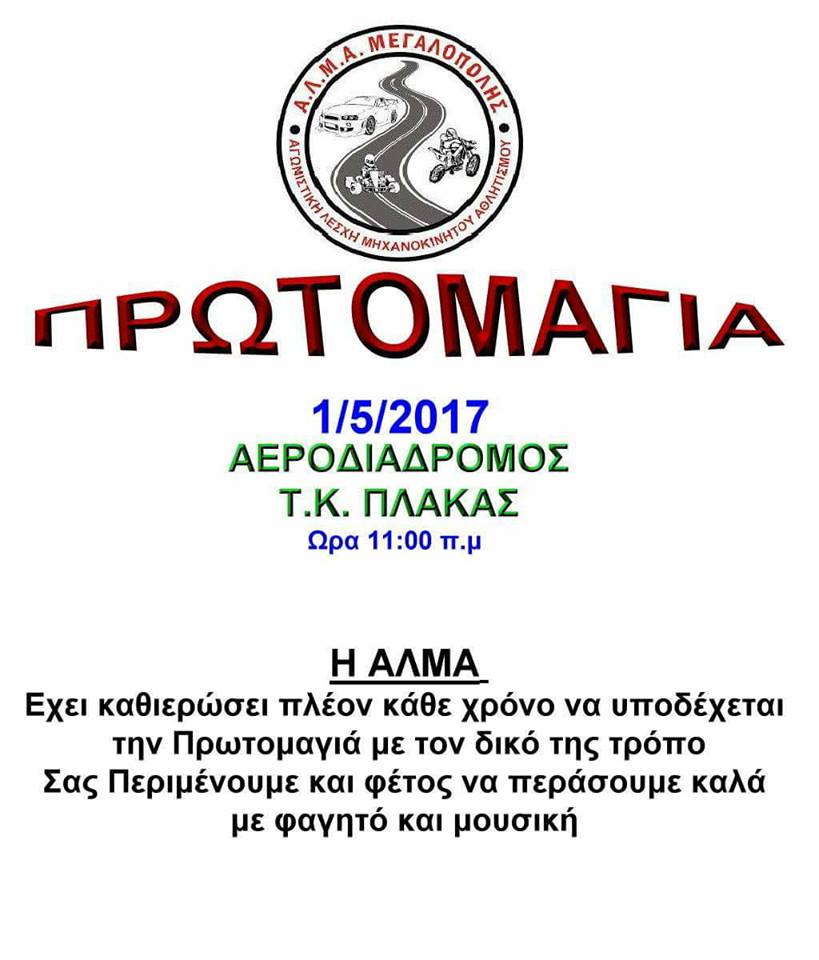 Την Δευτέρα 1η Μαΐου η Αγωνιστική Λέσχη Μηχανοκίνητου Αθλητισμού Μεγαλόπολης διοργανώνει για ακόμη μια χρονιά εκδήλωση για την Πρωτομαγιά.