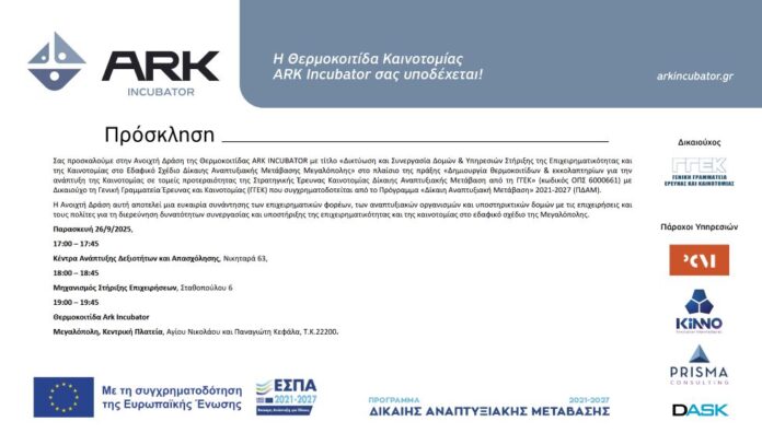 Σας προσκαλούμε στην Ανοιχτή Δράση της Θερμοκοιτίδας ARK INCUBATOR με τίτλο «Δικτύωση και Συνεργασία Δομών & Υπηρεσιών Στήριξης της Επιχειρηματικότητας και της Καινοτομίας στο Εδαφικό Σχέδιο Δίκαιης Αναπτυξιακής Μετάβασης Μεγαλόπολης» στο πλαίσιο της πράξης «Δημιουργία θερμοκοιτίδων & εκκολαπτηρίων για την ανάπτυξη της Καινοτομίας σε τομείς προτεραιότητας της Στρατηγικής Έρευνας Καινοτομίας Δίκαιης Αναπτυξιακής Μετάβαση από τη ΓΓΕΚ» (κωδικός ΟΠΣ 6000661) με Δικαιούχο τη Γενική Γραμματεία Έρευνας και Καινοτομίας (ΓΓΕΚ) που συγχρηματοδοτείται από το Πρόγραμμα «Δίκαιη Αναπτυξιακή Μετάβαση» 2021-2027 (ΠΔΑΜ).